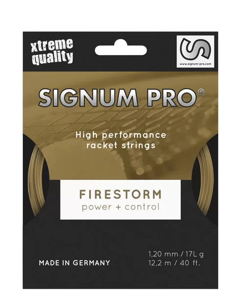 Cuerda Signum Pro Firestorm Dorada gracias a esta molécula, el cordaje Signum Firestorm ofrece un confort y rendimientos sin precedentes. La pérdida de tensión es reducida a su máximo y su longevidad rechazada.